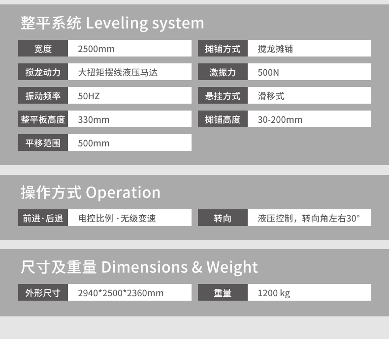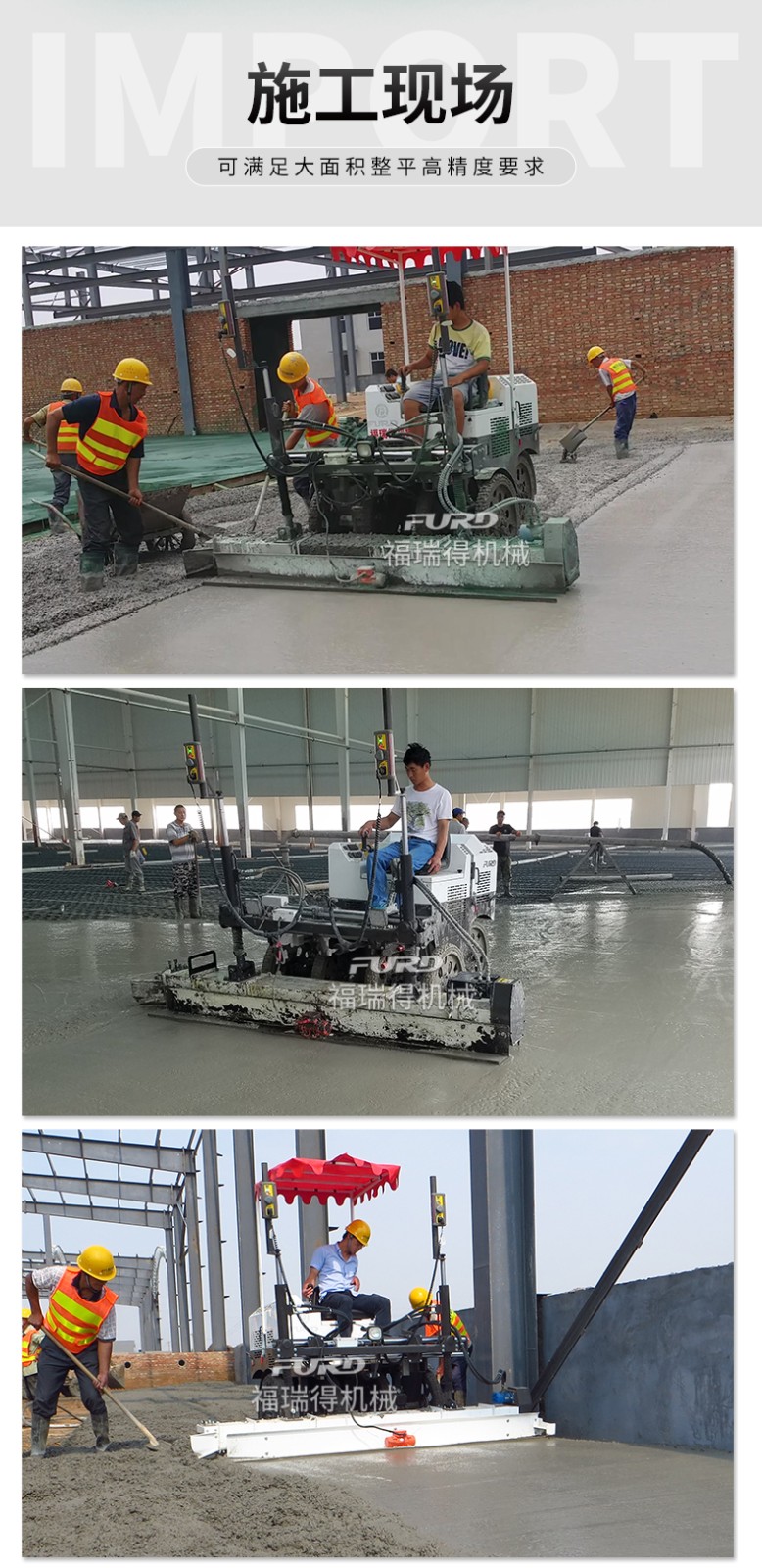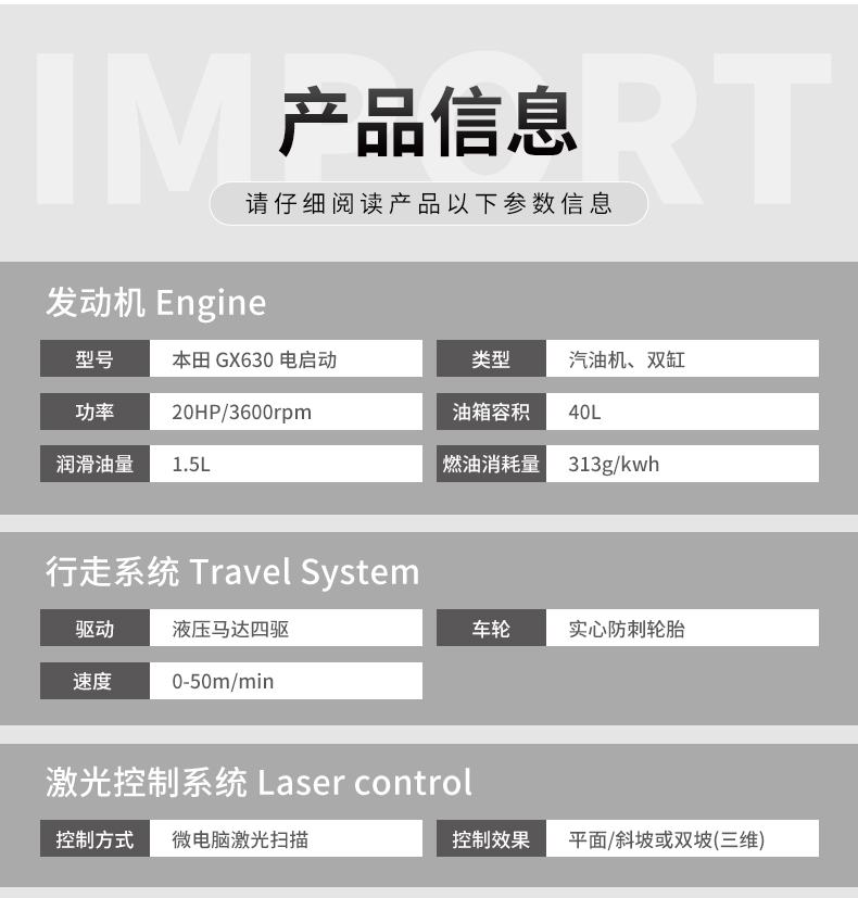 產(chǎn)品簡介:激光混凝土整平機利用先進的激光發(fā)射接收系統(tǒng)形成的閉環(huán)回路控制整平板尺的工作,精度高,廣泛用于現(xiàn)代工業(yè)廠房、大型購物場所、貨倉及其它大面積混凝土地面施工。