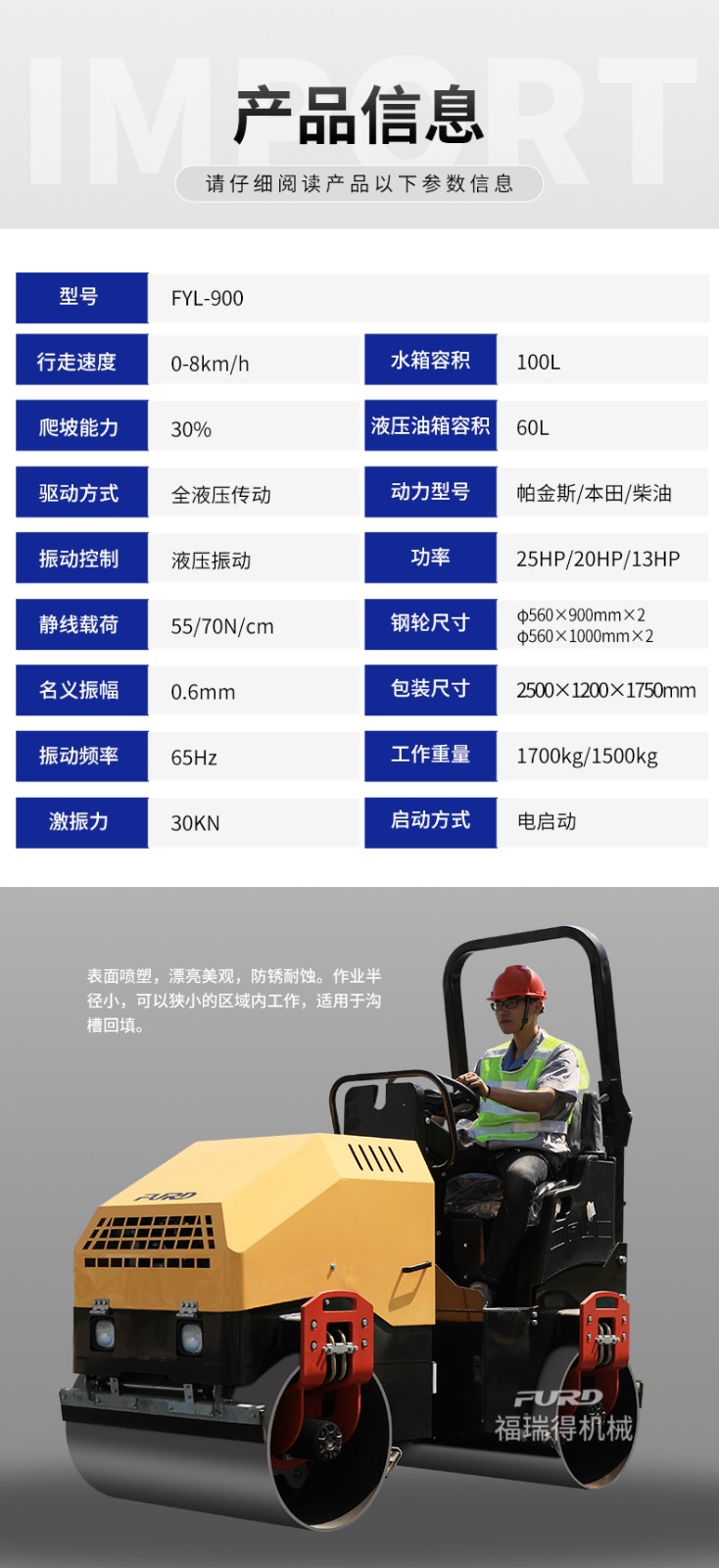 產(chǎn)品名稱:FYL-900 1.7T全液壓振動(dòng)壓路機(jī)